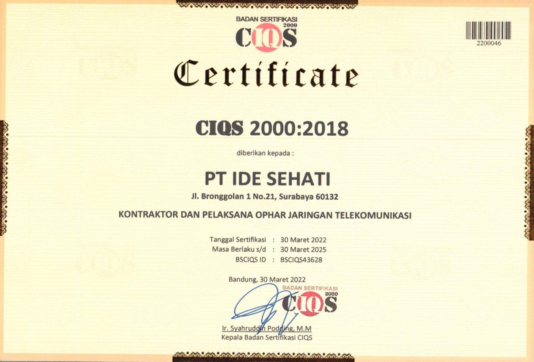 Sertifikat CIQS 2000:2018
