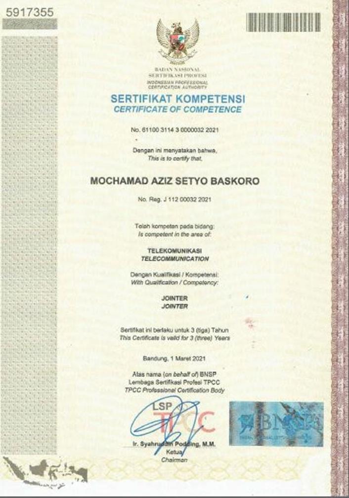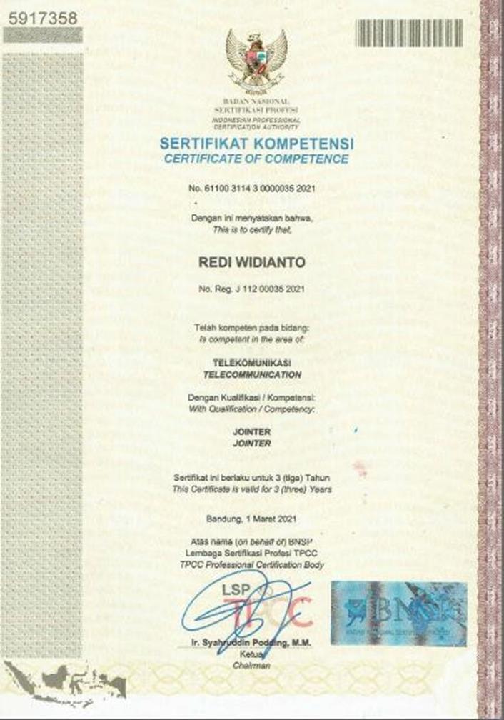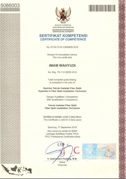 Sertifikat Teknisi Instalasi Fiber Optic